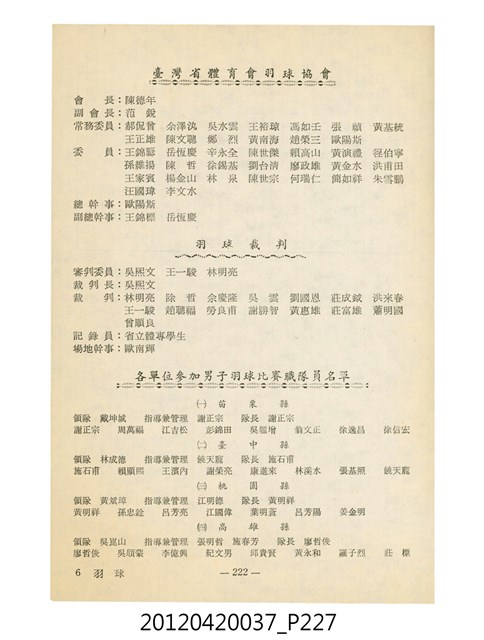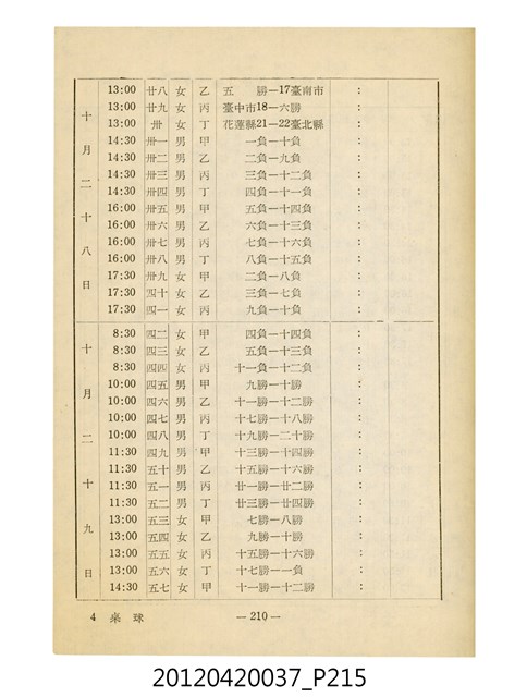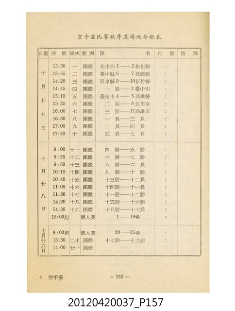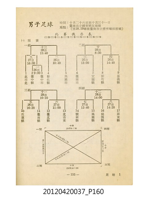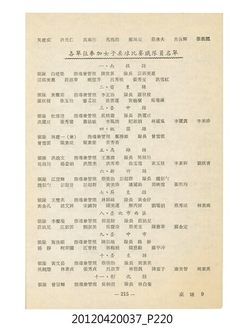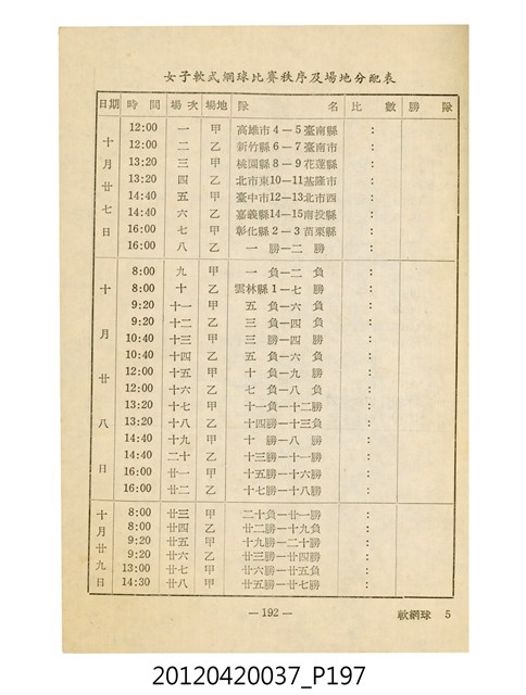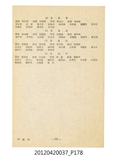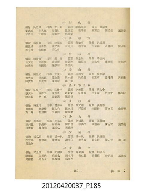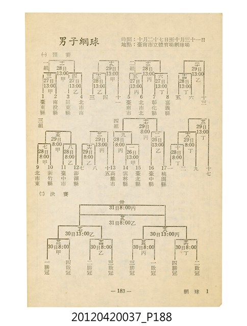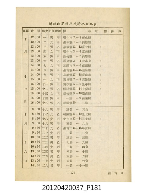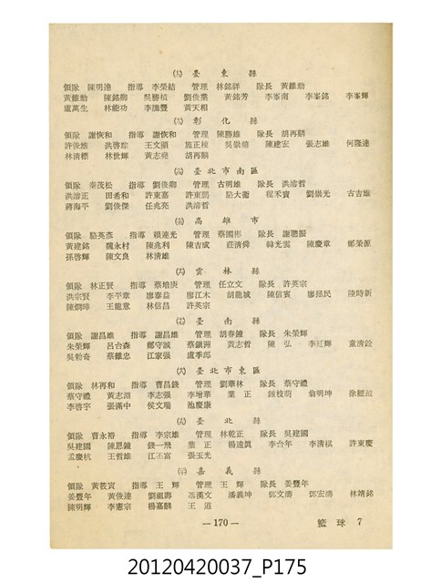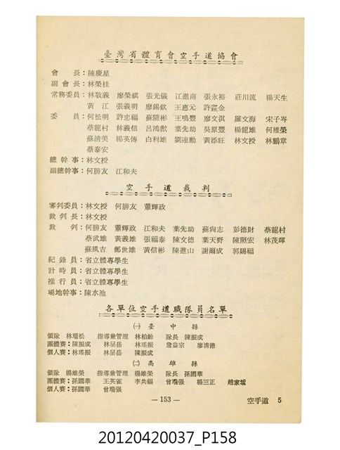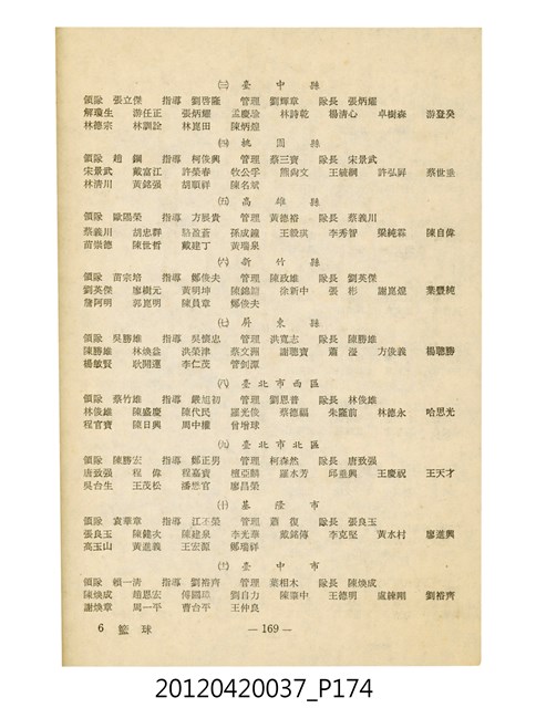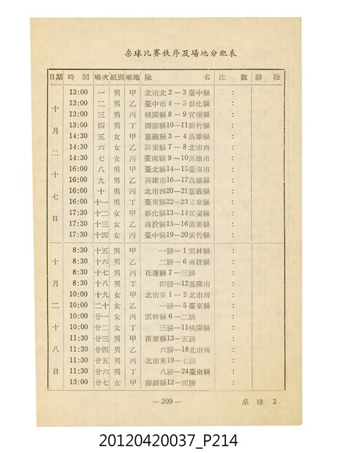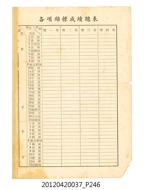 民國六十三年開始全省運動會改為臺灣區運動會,每年舉辦自民國六十三年至民國八十七年總共舉辦25屆。中華民國六十七年台灣區運動會於民國六十七年十月二十六日至十月三十一日在臺南市舉行,秩序冊封面設計以黃色為底中間以21個綠色方框,方框內有運動人形代表21項比賽項目,搭配銀色台灣區運圖騰,封底為運動會各項比賽場地與日程表。秩序冊記載開幕典禮與閉幕典禮儀式與表演安排以及裁判、計時、記錄人員及參賽者組成名單和號碼,為賽事舉行的主要依據包括比賽規約、賽制、賽事項目的日程和分組表,並提供交通規劃、動線與地點安排等資訊。