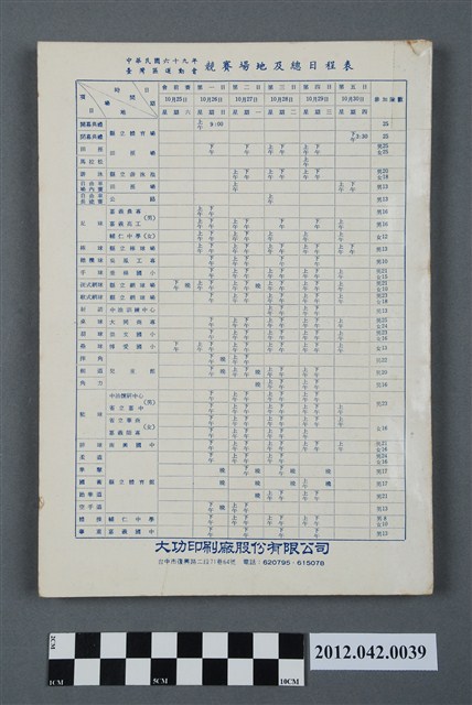 民國六十三年開始全省運動會改為臺灣區運動會,每年舉辦自民國六十三年至民國八十七年總共舉辦25屆。中華民國六十九年台灣區運動會於民國六十九年十月二十五日至十月三十日在嘉義縣舉行,秩序冊封面設計以素面白色為底中央以20個藍色方框,方框內有藍色運動人形代表20項比賽項目為主題,搭配金色台灣區運圖騰,封底為運動會各項比賽場地與日程表。搭配金色台灣區運圖騰,封底為運動會各項比賽場地與日程表。秩序冊記載開幕典禮與閉幕典禮儀式與表演安排以及裁判、計時、記錄人員及參賽者組成名單和號碼,為賽事舉行的主要依據包括比賽規約、賽制、賽事項目的日程和分組表,並提供交通規劃、動線與地點安排等資訊。