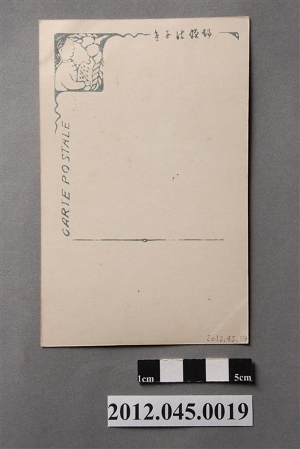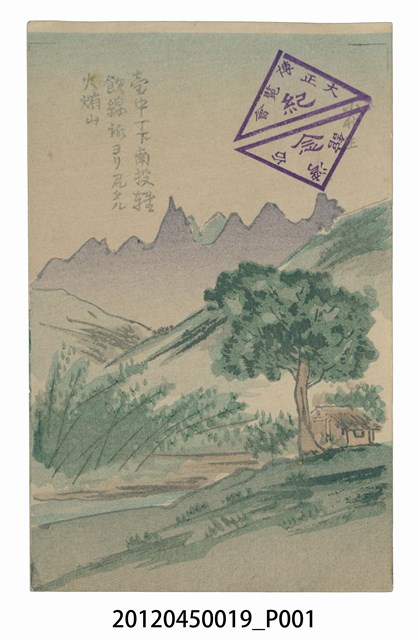 1.本物件為臺中往南投景觀繪圖明信片。正面為景觀繪圖,採直式彩色印刷。圖畫下方右半部為小山坡,小山坡上有1棵大樹,大樹下有1棟傳統平房;左半部有小河流經;較遠處繪有綠色的山,更後方為火炎山,前後形成對比。圖畫左上部由右而左直寫3行之「臺中广下南投轉飲線?ヨリ?タル火烠山」之說明,右上處有「小竹生」之署名,右上角署名處覆蓋有「大正博覽會臺灣館紀念章」,紀念章是由正三角形和倒三角形構成方形,兩三角形間留有空隙,上面的正三角形依序在右邊、頂點、左邊印有「大正博覽會」字樣,中間印「紀」字;下面的倒三角形中間印「念」字,左邊、頂點、右邊依序倒寫「臺灣館」字樣。背面為明信片書寫面,中央偏左處繪製豎線,豎線中央為線包圍的小圓圈;中央上方橫印「CARTE POSTALE」之明信片法文;右上角印有黑色方框,方框內以垂直90度繪製女子圖案;最右側由右而左垂直90度以草書印上「郵便はがき」,為日文明信片之意。2.本物件圖像依其畫面與文字推測,描繪的應為臺中廳往南投路上可以看見的特殊火炎山地貌,今名為「九九峰」。3.1914年,日本在東京上野公園舉辦大正博覽會,會場內設置臺灣館,推廣臺灣物產、名勝及介紹臺灣原住民。
