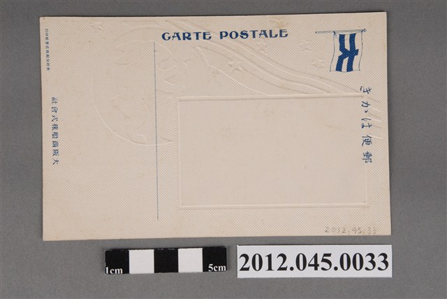 1.本物件為以大阪商船株式會社玉兔背景臺南丸為主題之明信片,正面右上方位置有黃色的月亮及深藍色手持木杵的玉兔圖樣,右側有1個船型剪影,左上方有1道以銀河為意象的圖樣,底色為深藍色,上方有象徵河流的銀色曲線,並有7顆銀色星星散布,左下角處有1張1艘輪船的黑白照片,輪船前後各有1根桅桿,中間有1個正在冒煙的煙囪,上方標有「大阪商船株式會社」、「臺南丸」。背面為空白明信片直式書寫面,以深藍色單色印刷,左上方有1旗幟,其為大阪商船株式會社之標誌,上方有「郵便はがき」,下方有「大阪商船株式會社」、「光封印刷株式會社印行」,左側有「CARTE POSTALE」,中間偏下位置有1分隔線。2.臺南丸為西元1897年所建造,屬大阪商船株式會社之貨客船。臺南丸與臺北丸、臺中丸為大阪商船特地為神戶基隆線建造的貨客船。