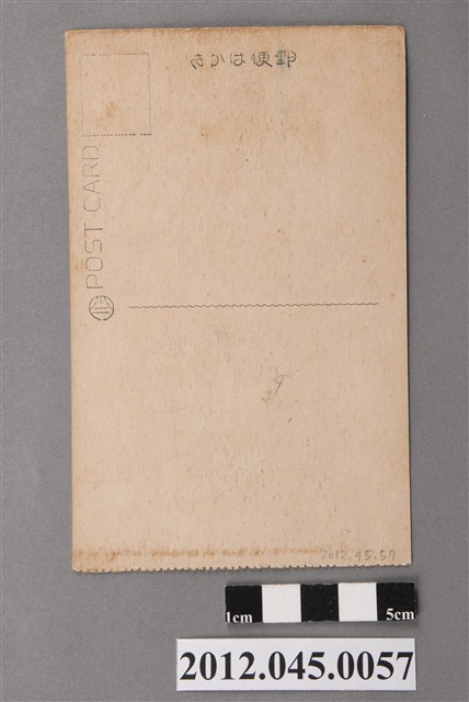 1. 本物件為以臺灣名妓藝姐為主題之明信片,正面為1名女性半身黑白照片,影像中女性應為坐姿,耳朵上掛有耳墜,動作為以右手輕撐臉頰,左手拿著書本輕放腿上之坐姿,上身穿著中式服裝,影像下方標有「臺灣ノ名妓」、「(藝姐)」。背面為空白明信片直式書寫面,以黑色單色印刷,左上角有郵票黏貼處,上側有「郵便はがき」,左側有一圓形圖章,其圖樣為山形,其上方印有「POST CARD」,中間有一曲線分隔線。2.藝旦為臺灣日治時期出現的一種女性職業,通常熟知音律且識字,會於高級酒樓中彈琴、吟唱、伴舞、作戲等,是為高級文人仕紳餐會中伺陪和買笑談天的對象,藝旦不賣身,只賣其技藝,其演出中表演的戲劇,更是開創臺灣女性演劇之先鋒,其工作場所接為上等高級酒樓,如大稻埕的江山樓、蓬萊閣,因其工作性質的關係,藝旦之穿著打扮較為時尚,談吐較為高雅,被視為新時代女性的象徵。