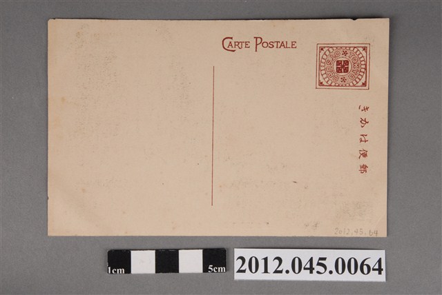 1.本物件為以臺南故北白川宮殿下御遺跡所為主題之明信片,正面為1座神社黑白照片,影像中央的階梯兩側各有1個菊花圖樣的燈籠及1個石燈籠,中間有1座鳥居,鳥居上方繫有注連繩,下方兩側各有1隻應為石獅子的石像,神社的建築物中間處有1個賽錢箱,兩旁有菊花圖樣,影像下方標註「臺南故北白川宮殿下御遺跡所」。背面為空白明信片橫式書寫面,以暗紅色單色印刷,右上方框中有1圓形圖樣,並標有「TOKYO」、「OTSUBO」,右側有「郵便はがき」,上方偏右位置標有「CARTE POSTALE」,中間有1道分隔線。