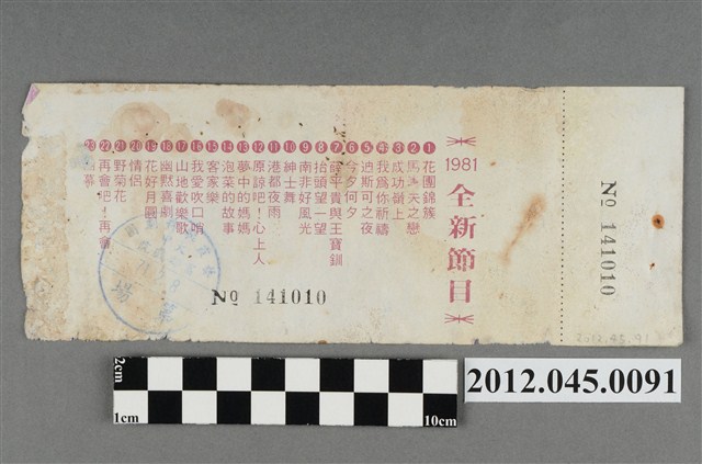 「藝霞歌舞劇團」演出前座全票,背後蓋有編號,「藝霞歌舞劇團-大甲-富都戲院-71.2.8」戳章,代表是1982年2月8日該劇團於大甲富都戲院演出,由劇院蓋戳章準備販售的入場票,本文物共九張,正面均印有1981年藝霞歌舞劇團最新演出劇碼「最新流行壯觀的現代歌舞:迪斯可之夜」的謝幕畫面,背面印有「1981年全新節目」的節目流程,內容包括〈花團錦簇〉、〈馬車伕之戀〉、〈成功嶺上〉、〈我為你祝福〉、〈迪斯可之夜〉…等共23項。