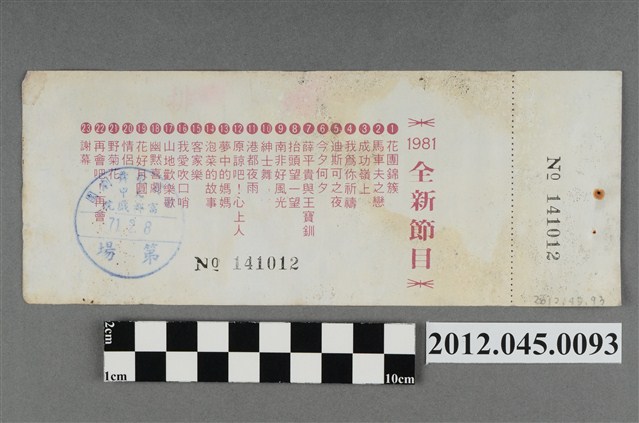 「藝霞歌舞劇團」演出前座全票,背後蓋有編號,「藝霞歌舞劇團-大甲-富都戲院-71.2.8」戳章,代表是1982年2月8日該劇團於大甲富都戲院演出,由劇院蓋戳章準備販售的入場票,本文物共九張,正面均印有1981年藝霞歌舞劇團最新演出劇碼「最新流行壯觀的現代歌舞:迪斯可之夜」的謝幕畫面,背面印有「1981年全新節目」的節目流程,內容包括〈花團錦簇〉、〈馬車伕之戀〉、〈成功嶺上〉、〈我為你祝福〉、〈迪斯可之夜〉…等共23項。