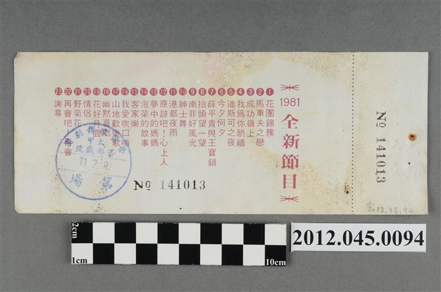 「藝霞歌舞劇團」演出前座全票,背後蓋有編號,「藝霞歌舞劇團-大甲-富都戲院-71.2.8」戳章,代表是1982年2月8日該劇團於大甲富都戲院演出,由劇院蓋戳章準備販售的入場票,本文物共九張,正面均印有1981年藝霞歌舞劇團最新演出劇碼「最新流行壯觀的現代歌舞:迪斯可之夜」的謝幕畫面,背面印有「1981年全新節目」的節目流程,內容包括〈花團錦簇〉、〈馬車伕之戀〉、〈成功嶺上〉、〈我為你祝福〉、〈迪斯可之夜〉…等共23項。