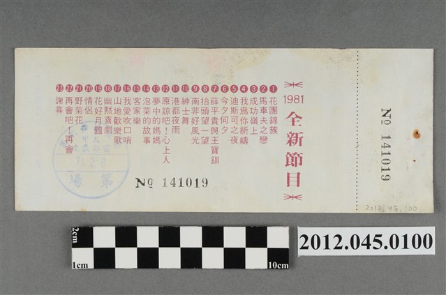 「藝霞歌舞劇團」演出前座全票,背後蓋有編號,「藝霞歌舞劇團-大甲-富都戲院-71.2.8」戳章,代表是1982年2月8日該劇團於大甲富都戲院演出,由劇院蓋戳章準備販售的入場票,本文物共九張,正面均印有1981年藝霞歌舞劇團最新演出劇碼「最新流行壯觀的現代歌舞:迪斯可之夜」的謝幕畫面,背面印有「1981年全新節目」的節目流程,內容包括〈花團錦簇〉、〈馬車伕之戀〉、〈成功嶺上〉、〈我為你祝福〉、〈迪斯可之夜〉…等共23項。