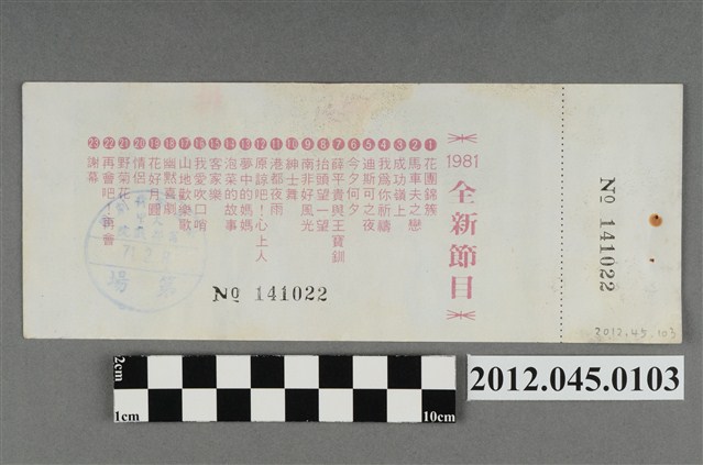 「藝霞歌舞劇團」演出前座全票,背後蓋有編號,「藝霞歌舞劇團-大甲-富都戲院-71.2.8」戳章,代表是1982年2月8日該劇團於大甲富都戲院演出,由劇院蓋戳章準備販售的入場票,本文物共九張,正面均印有1981年藝霞歌舞劇團最新演出劇碼「最新流行壯觀的現代歌舞:迪斯可之夜」的謝幕畫面,背面印有「1981年全新節目」的節目流程,內容包括〈花團錦簇〉、〈馬車伕之戀〉、〈成功嶺上〉、〈我為你祝福〉、〈迪斯可之夜〉…等共23項。