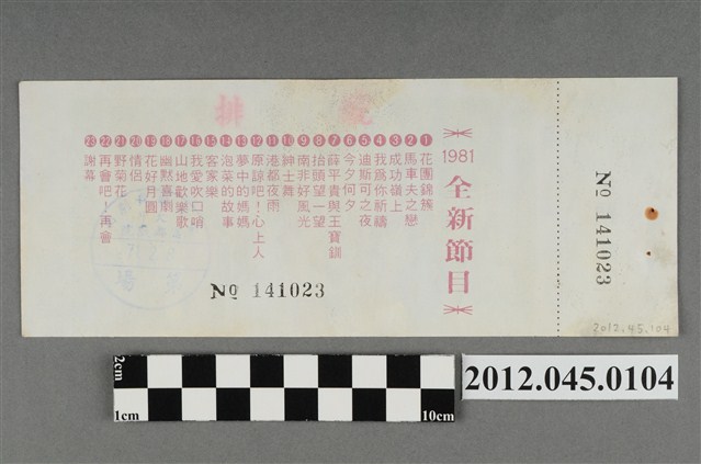 「藝霞歌舞劇團」演出前座全票,背後蓋有編號,「藝霞歌舞劇團-大甲-富都戲院-71.2.8」戳章,代表是1982年2月8日該劇團於大甲富都戲院演出,由劇院蓋戳章準備販售的入場票,本文物共九張,正面均印有1981年藝霞歌舞劇團最新演出劇碼「最新流行壯觀的現代歌舞:迪斯可之夜」的謝幕畫面,背面印有「1981年全新節目」的節目流程,內容包括〈花團錦簇〉、〈馬車伕之戀〉、〈成功嶺上〉、〈我為你祝福〉、〈迪斯可之夜〉…等共23項。