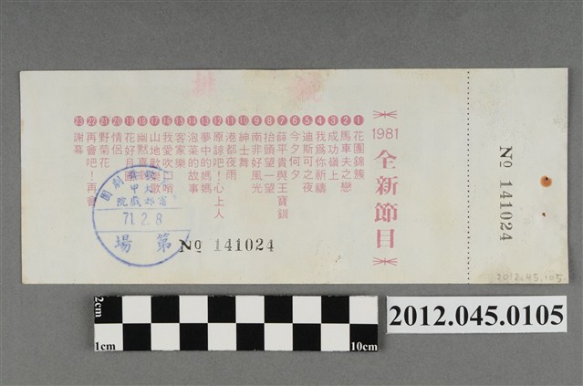 「藝霞歌舞劇團」演出前座全票,背後蓋有編號,「藝霞歌舞劇團-大甲-富都戲院-71.2.8」戳章,代表是1982年2月8日該劇團於大甲富都戲院演出,由劇院蓋戳章準備販售的入場票,本文物共九張,正面均印有1981年藝霞歌舞劇團最新演出劇碼「最新流行壯觀的現代歌舞:迪斯可之夜」的謝幕畫面,背面印有「1981年全新節目」的節目流程,內容包括〈花團錦簇〉、〈馬車伕之戀〉、〈成功嶺上〉、〈我為你祝福〉、〈迪斯可之夜〉…等共23項。