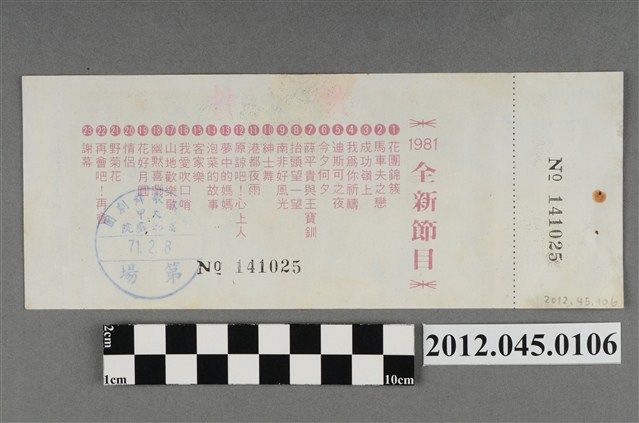 「藝霞歌舞劇團」演出前座全票,背後蓋有編號,「藝霞歌舞劇團-大甲-富都戲院-71.2.8」戳章,代表是1982年2月8日該劇團於大甲富都戲院演出,由劇院蓋戳章準備販售的入場票,本文物共九張,正面均印有1981年藝霞歌舞劇團最新演出劇碼「最新流行壯觀的現代歌舞:迪斯可之夜」的謝幕畫面,背面印有「1981年全新節目」的節目流程,內容包括〈花團錦簇〉、〈馬車伕之戀〉、〈成功嶺上〉、〈我為你祝福〉、〈迪斯可之夜〉…等共23項。