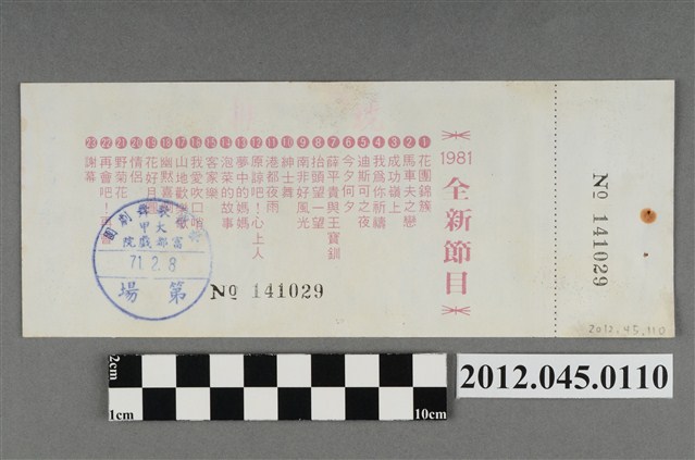 「藝霞歌舞劇團」演出前座全票,背後蓋有編號,「藝霞歌舞劇團-大甲-富都戲院-71.2.8」戳章,代表是1982年2月8日該劇團於大甲富都戲院演出,由劇院蓋戳章準備販售的入場票,本文物共九張,正面均印有1981年藝霞歌舞劇團最新演出劇碼「最新流行壯觀的現代歌舞:迪斯可之夜」的謝幕畫面,背面印有「1981年全新節目」的節目流程,內容包括〈花團錦簇〉、〈馬車伕之戀〉、〈成功嶺上〉、〈我為你祝福〉、〈迪斯可之夜〉…等共23項。