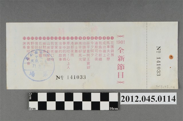 「藝霞歌舞劇團」演出前座全票,背後蓋有編號,「藝霞歌舞劇團-大甲-富都戲院-71.2.8」戳章,代表是1982年2月8日該劇團於大甲富都戲院演出,由劇院蓋戳章準備販售的入場票,本文物共九張,正面均印有1981年藝霞歌舞劇團最新演出劇碼「最新流行壯觀的現代歌舞:迪斯可之夜」的謝幕畫面,背面印有「1981年全新節目」的節目流程,內容包括〈花團錦簇〉、〈馬車伕之戀〉、〈成功嶺上〉、〈我為你祝福〉、〈迪斯可之夜〉…等共23項。