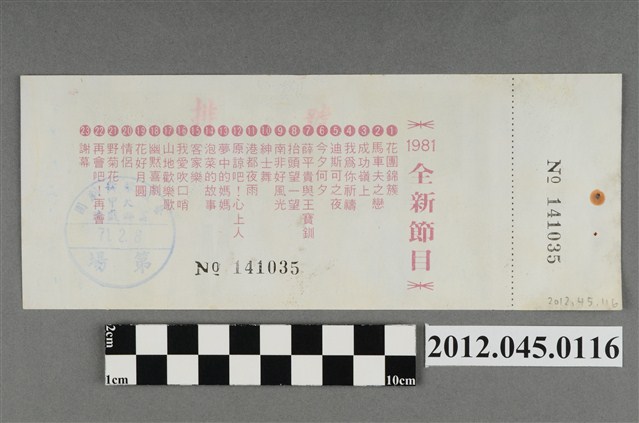 「藝霞歌舞劇團」演出前座全票,背後蓋有編號,「藝霞歌舞劇團-大甲-富都戲院-71.2.8」戳章,代表是1982年2月8日該劇團於大甲富都戲院演出,由劇院蓋戳章準備販售的入場票,本文物共九張,正面均印有1981年藝霞歌舞劇團最新演出劇碼「最新流行壯觀的現代歌舞:迪斯可之夜」的謝幕畫面,背面印有「1981年全新節目」的節目流程,內容包括〈花團錦簇〉、〈馬車伕之戀〉、〈成功嶺上〉、〈我為你祝福〉、〈迪斯可之夜〉…等共23項。