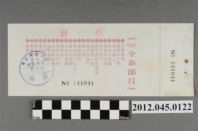 「藝霞歌舞劇團」演出前座全票,背後蓋有編號,「藝霞歌舞劇團-大甲-富都戲院-71.2.8」戳章,代表是1982年2月8日該劇團於大甲富都戲院演出,由劇院蓋戳章準備販售的入場票,本文物共九張,正面均印有1981年藝霞歌舞劇團最新演出劇碼「最新流行壯觀的現代歌舞:迪斯可之夜」的謝幕畫面,背面印有「1981年全新節目」的節目流程,內容包括〈花團錦簇〉、〈馬車伕之戀〉、〈成功嶺上〉、〈我為你祝福〉、〈迪斯可之夜〉…等共23項。