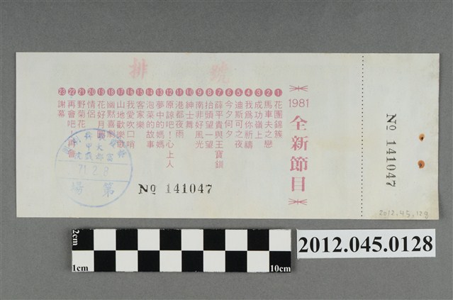 「藝霞歌舞劇團」演出前座全票,背後蓋有編號,「藝霞歌舞劇團-大甲-富都戲院-71.2.8」戳章,代表是1982年2月8日該劇團於大甲富都戲院演出,由劇院蓋戳章準備販售的入場票,本文物共九張,正面均印有1981年藝霞歌舞劇團最新演出劇碼「最新流行壯觀的現代歌舞:迪斯可之夜」的謝幕畫面,背面印有「1981年全新節目」的節目流程,內容包括〈花團錦簇〉、〈馬車伕之戀〉、〈成功嶺上〉、〈我為你祝福〉、〈迪斯可之夜〉…等共23項。
