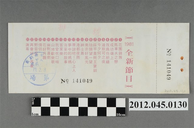 「藝霞歌舞劇團」演出前座全票,背後蓋有編號,「藝霞歌舞劇團-大甲-富都戲院-71.2.8」戳章,代表是1982年2月8日該劇團於大甲富都戲院演出,由劇院蓋戳章準備販售的入場票,本文物共九張,正面均印有1981年藝霞歌舞劇團最新演出劇碼「最新流行壯觀的現代歌舞:迪斯可之夜」的謝幕畫面,背面印有「1981年全新節目」的節目流程,內容包括〈花團錦簇〉、〈馬車伕之戀〉、〈成功嶺上〉、〈我為你祝福〉、〈迪斯可之夜〉…等共23項。