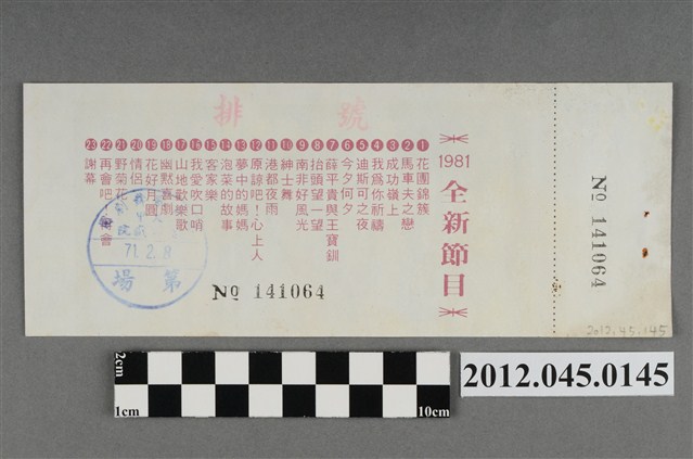 「藝霞歌舞劇團」演出前座全票,背後蓋有編號,「藝霞歌舞劇團-大甲-富都戲院-71.2.8」戳章,代表是1982年2月8日該劇團於大甲富都戲院演出,由劇院蓋戳章準備販售的入場票,本文物共九張,正面均印有1981年藝霞歌舞劇團最新演出劇碼「最新流行壯觀的現代歌舞:迪斯可之夜」的謝幕畫面,背面印有「1981年全新節目」的節目流程,內容包括〈花團錦簇〉、〈馬車伕之戀〉、〈成功嶺上〉、〈我為你祝福〉、〈迪斯可之夜〉…等共23項。