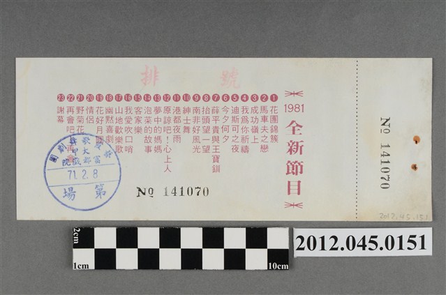 「藝霞歌舞劇團」演出前座全票,背後蓋有編號,「藝霞歌舞劇團-大甲-富都戲院-71.2.8」戳章,代表是1982年2月8日該劇團於大甲富都戲院演出,由劇院蓋戳章準備販售的入場票,本文物共九張,正面均印有1981年藝霞歌舞劇團最新演出劇碼「最新流行壯觀的現代歌舞:迪斯可之夜」的謝幕畫面,背面印有「1981年全新節目」的節目流程,內容包括〈花團錦簇〉、〈馬車伕之戀〉、〈成功嶺上〉、〈我為你祝福〉、〈迪斯可之夜〉…等共23項。