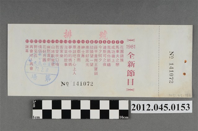「藝霞歌舞劇團」演出前座全票,背後蓋有編號,「藝霞歌舞劇團-大甲-富都戲院-71.2.8」戳章,代表是1982年2月8日該劇團於大甲富都戲院演出,由劇院蓋戳章準備販售的入場票,本文物共九張,正面均印有1981年藝霞歌舞劇團最新演出劇碼「最新流行壯觀的現代歌舞:迪斯可之夜」的謝幕畫面,背面印有「1981年全新節目」的節目流程,內容包括〈花團錦簇〉、〈馬車伕之戀〉、〈成功嶺上〉、〈我為你祝福〉、〈迪斯可之夜〉…等共23項。