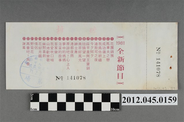 「藝霞歌舞劇團」演出前座全票,背後蓋有編號,「藝霞歌舞劇團-大甲-富都戲院-71.2.8」戳章,代表是1982年2月8日該劇團於大甲富都戲院演出,由劇院蓋戳章準備販售的入場票,本文物共九張,正面均印有1981年藝霞歌舞劇團最新演出劇碼「最新流行壯觀的現代歌舞:迪斯可之夜」的謝幕畫面,背面印有「1981年全新節目」的節目流程,內容包括〈花團錦簇〉、〈馬車伕之戀〉、〈成功嶺上〉、〈我為你祝福〉、〈迪斯可之夜〉…等共23項。