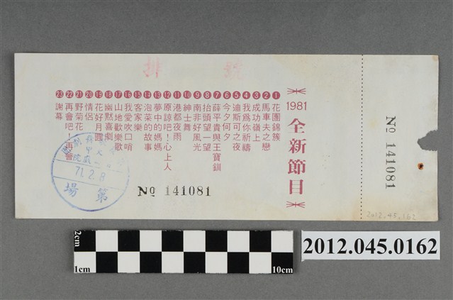 「藝霞歌舞劇團」演出前座全票,背後蓋有編號,「藝霞歌舞劇團-大甲-富都戲院-71.2.8」戳章,代表是1982年2月8日該劇團於大甲富都戲院演出,由劇院蓋戳章準備販售的入場票,本文物共九張,正面均印有1981年藝霞歌舞劇團最新演出劇碼「最新流行壯觀的現代歌舞:迪斯可之夜」的謝幕畫面,背面印有「1981年全新節目」的節目流程,內容包括〈花團錦簇〉、〈馬車伕之戀〉、〈成功嶺上〉、〈我為你祝福〉、〈迪斯可之夜〉…等共23項。