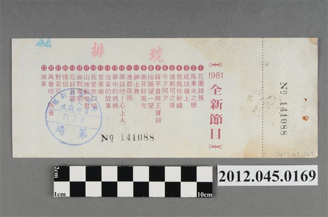 「藝霞歌舞劇團」演出前座全票,背後蓋有編號,「藝霞歌舞劇團-大甲-富都戲院-71.2.8」戳章,代表是1982年2月8日該劇團於大甲富都戲院演出,由劇院蓋戳章準備販售的入場票,本文物共九張,正面均印有1981年藝霞歌舞劇團最新演出劇碼「最新流行壯觀的現代歌舞:迪斯可之夜」的謝幕畫面,背面印有「1981年全新節目」的節目流程,內容包括〈花團錦簇〉、〈馬車伕之戀〉、〈成功嶺上〉、〈我為你祝福〉、〈迪斯可之夜〉…等共23項。