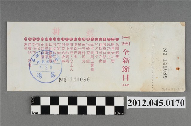 「藝霞歌舞劇團」演出前座全票,背後蓋有編號,「藝霞歌舞劇團-大甲-富都戲院-71.2.8」戳章,代表是1982年2月8日該劇團於大甲富都戲院演出,由劇院蓋戳章準備販售的入場票,本文物共九張,正面均印有1981年藝霞歌舞劇團最新演出劇碼「最新流行壯觀的現代歌舞:迪斯可之夜」的謝幕畫面,背面印有「1981年全新節目」的節目流程,內容包括〈花團錦簇〉、〈馬車伕之戀〉、〈成功嶺上〉、〈我為你祝福〉、〈迪斯可之夜〉…等共23項。