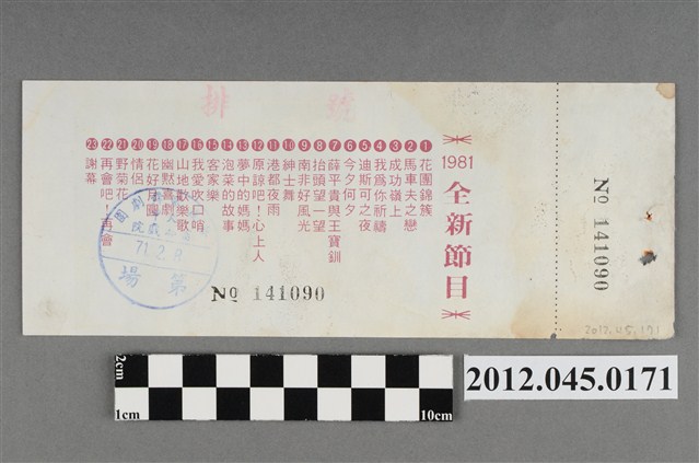 「藝霞歌舞劇團」演出前座全票,背後蓋有編號,「藝霞歌舞劇團-大甲-富都戲院-71.2.8」戳章,代表是1982年2月8日該劇團於大甲富都戲院演出,由劇院蓋戳章準備販售的入場票,本文物共九張,正面均印有1981年藝霞歌舞劇團最新演出劇碼「最新流行壯觀的現代歌舞:迪斯可之夜」的謝幕畫面,背面印有「1981年全新節目」的節目流程,內容包括〈花團錦簇〉、〈馬車伕之戀〉、〈成功嶺上〉、〈我為你祝福〉、〈迪斯可之夜〉…等共23項。