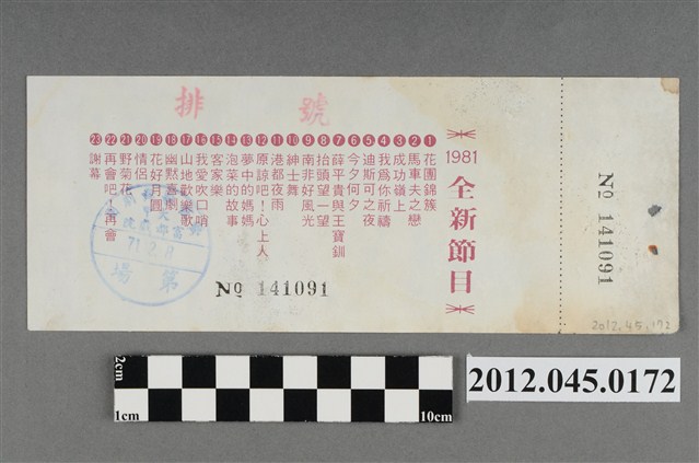 「藝霞歌舞劇團」演出前座全票,背後蓋有編號,「藝霞歌舞劇團-大甲-富都戲院-71.2.8」戳章,代表是1982年2月8日該劇團於大甲富都戲院演出,由劇院蓋戳章準備販售的入場票,本文物共九張,正面均印有1981年藝霞歌舞劇團最新演出劇碼「最新流行壯觀的現代歌舞:迪斯可之夜」的謝幕畫面,背面印有「1981年全新節目」的節目流程,內容包括〈花團錦簇〉、〈馬車伕之戀〉、〈成功嶺上〉、〈我為你祝福〉、〈迪斯可之夜〉…等共23項。