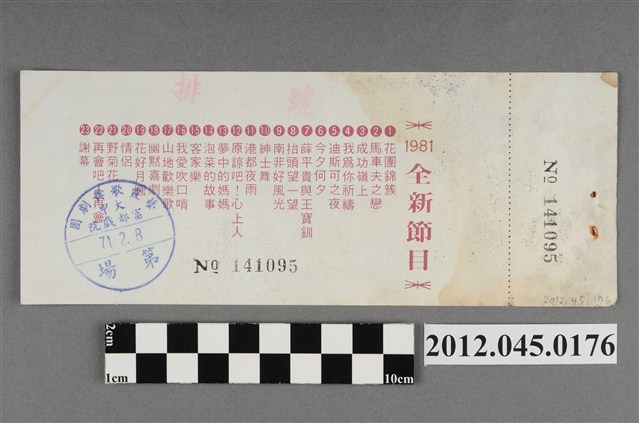 「藝霞歌舞劇團」演出前座全票,背後蓋有編號,「藝霞歌舞劇團-大甲-富都戲院-71.2.8」戳章,代表是1982年2月8日該劇團於大甲富都戲院演出,由劇院蓋戳章準備販售的入場票,本文物共九張,正面均印有1981年藝霞歌舞劇團最新演出劇碼「最新流行壯觀的現代歌舞:迪斯可之夜」的謝幕畫面,背面印有「1981年全新節目」的節目流程,內容包括〈花團錦簇〉、〈馬車伕之戀〉、〈成功嶺上〉、〈我為你祝福〉、〈迪斯可之夜〉…等共23項。