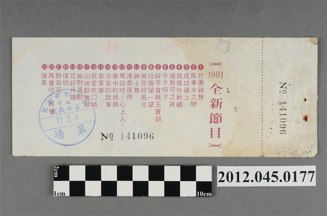 「藝霞歌舞劇團」演出前座全票,背後蓋有編號,「藝霞歌舞劇團-大甲-富都戲院-71.2.8」戳章,代表是1982年2月8日該劇團於大甲富都戲院演出,由劇院蓋戳章準備販售的入場票,本文物共九張,正面均印有1981年藝霞歌舞劇團最新演出劇碼「最新流行壯觀的現代歌舞:迪斯可之夜」的謝幕畫面,背面印有「1981年全新節目」的節目流程,內容包括〈花團錦簇〉、〈馬車伕之戀〉、〈成功嶺上〉、〈我為你祝福〉、〈迪斯可之夜〉…等共23項。