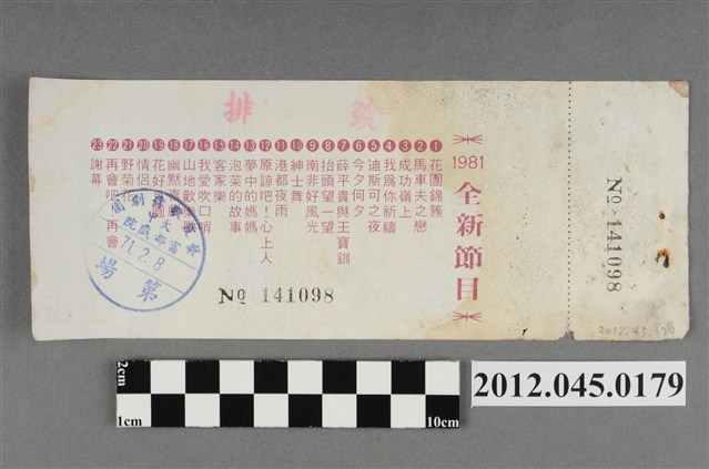 「藝霞歌舞劇團」演出前座全票,背後蓋有編號,「藝霞歌舞劇團-大甲-富都戲院-71.2.8」戳章,代表是1982年2月8日該劇團於大甲富都戲院演出,由劇院蓋戳章準備販售的入場票,本文物共九張,正面均印有1981年藝霞歌舞劇團最新演出劇碼「最新流行壯觀的現代歌舞:迪斯可之夜」的謝幕畫面,背面印有「1981年全新節目」的節目流程,內容包括〈花團錦簇〉、〈馬車伕之戀〉、〈成功嶺上〉、〈我為你祝福〉、〈迪斯可之夜〉…等共23項。
