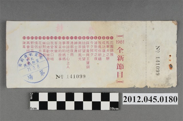 「藝霞歌舞劇團」演出前座全票,背後蓋有編號,「藝霞歌舞劇團-大甲-富都戲院-71.2.8」戳章,代表是1982年2月8日該劇團於大甲富都戲院演出,由劇院蓋戳章準備販售的入場票,本文物共九張,正面均印有1981年藝霞歌舞劇團最新演出劇碼「最新流行壯觀的現代歌舞:迪斯可之夜」的謝幕畫面,背面印有「1981年全新節目」的節目流程,內容包括〈花團錦簇〉、〈馬車伕之戀〉、〈成功嶺上〉、〈我為你祝福〉、〈迪斯可之夜〉…等共23項。