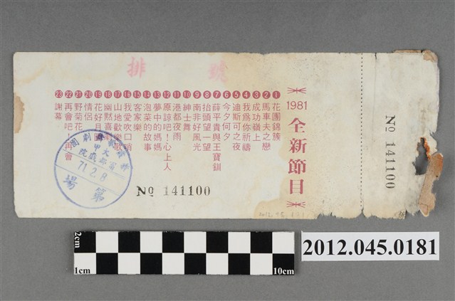 「藝霞歌舞劇團」演出前座全票,背後蓋有編號,「藝霞歌舞劇團-大甲-富都戲院-71.2.8」戳章,代表是1982年2月8日該劇團於大甲富都戲院演出,由劇院蓋戳章準備販售的入場票,本文物共九張,正面均印有1981年藝霞歌舞劇團最新演出劇碼「最新流行壯觀的現代歌舞:迪斯可之夜」的謝幕畫面,背面印有「1981年全新節目」的節目流程,內容包括〈花團錦簇〉、〈馬車伕之戀〉、〈成功嶺上〉、〈我為你祝福〉、〈迪斯可之夜〉…等共23項。