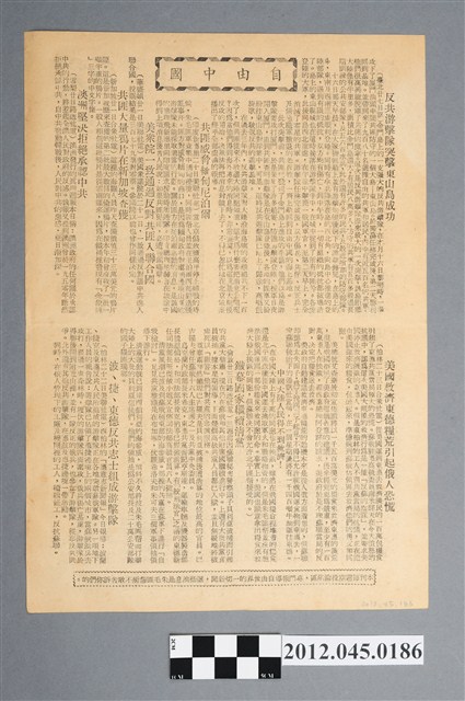 標題為「自由中國 第一五一期」,內容有〈韓戰一週〉、〈停戰協定可望簽字〉、〈法越傘兵破壞越共補給基地〉三篇新聞報導,與〈時評—共匪崩潰的前奏〉一文,附一幅國軍游擊隊突擊東山島成功、共軍投降、毛澤東在一旁跳腳的漫畫,背面有〈反共游擊隊突擊東山島成功〉、〈共匪威脅緬甸尼泊爾〉、〈美眾院一致通過反對共匪入聯合國〉、〈共匪大量鴉片在新加坡查獲〉、〈美國救濟東德糧荒引起俄人恐慌〉等報導。下方註明「本刊每週空投淪陷區,專門報導自由世界的一切新聞,這些消息是朱毛匪幫所不敢告訴你們的。」