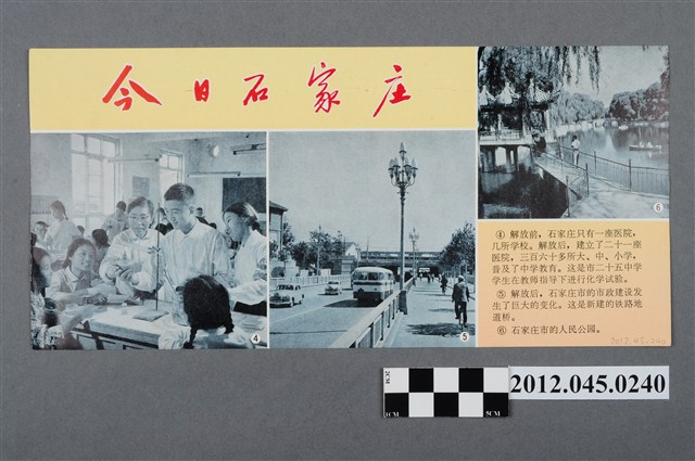 橫式單色雙面簡體字印刷。刊登石家莊的工業生產線、醫院、公園照片。