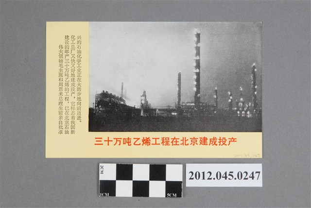 此物件為政治宣傳單,彩色雙面印刷,正面標題為「年產120萬噸煤的上海姚橋煤礦建成投產」,內容為介紹中華人民共和國煤礦、乙烯工業發展。此件為1970年代中華人民共和國針對臺灣所使用之政戰文宣,目的在拉近臺灣民眾對於「祖國大陸」的認同感,並拉攏臺灣人民。 中國共產黨主政的中華人民共和國對外宣傳每個時期都有不同的策略與政策,建國初期,中共對臺灣的政治宣傳以「武力解放臺灣」為主軸,至1954年第一次臺海危機之後,美國與中華民國簽訂「中美共同防禦條約」,中共宣傳政策因而轉以「和平解放臺灣」為主。代表性的做法是使用廣播、心戰傳單、報紙等媒介向臺灣散佈宣傳訊息,更於1958年在福建建立前線電台《海峽之聲》。 到了1970年代,美國與中共關係改善,除持續進行空飄傳單以及廣播外,更將工作目標轉向美國,鼓吹「中國人自己解決臺灣問題」,要求美軍自臺灣撤軍,並且在「釣魚台事件」中,爭取留學生以及華裔學者的認同。在鄧小平時期,中共則將宣傳主軸從「解放臺灣」轉為「和平統一」,並公開發表〈告臺灣同胞書〉以及〈關於停止砲擊大、小金門等島嶼的聲明〉,甚至發表「和平統一,一國兩制」之說,營照兩岸和平的氛圍。