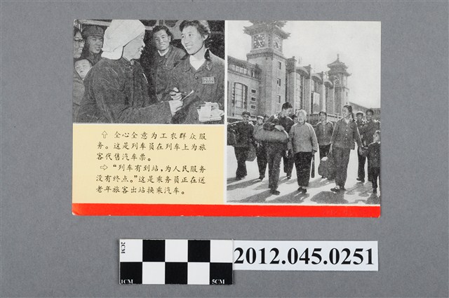 此物件為政治宣傳單,彩色雙面印刷,標題為「人民列車為人民」,內容為介紹中華人民共和國鐵路工作人員的服務熱誠。此件為1970年代中華人民共和國針對臺灣所使用之政戰文宣,目的在拉近臺灣民眾對於「祖國大陸」的認同感,並拉攏臺灣人民。 中國共產黨主政的中華人民共和國對外宣傳每個時期都有不同的策略與政策,建國初期,中共對臺灣的政治宣傳以「武力解放臺灣」為主軸,至1954年第一次臺海危機之後,美國與中華民國簽訂「中美共同防禦條約」,中共宣傳政策因而轉以「和平解放臺灣」為主。代表性的做法是使用廣播、心戰傳單、報紙等媒介向臺灣散佈宣傳訊息,更於1958年在福建建立前線電台《海峽之聲》。 到了1970年代,美國與中共關係改善,除持續進行空飄傳單以及廣播外,更將工作目標轉向美國,鼓吹「中國人自己解決臺灣問題」,要求美軍自臺灣撤軍,並且在「釣魚台事件」中,爭取留學生以及華裔學者的認同。在鄧小平時期,中共則將宣傳主軸從「解放臺灣」轉為「和平統一」,並公開發表〈告臺灣同胞書〉以及〈關於停止砲擊大、小金門等島嶼的聲明〉,甚至發表「和平統一,一國兩制」之說,營照兩岸和平的氛圍。