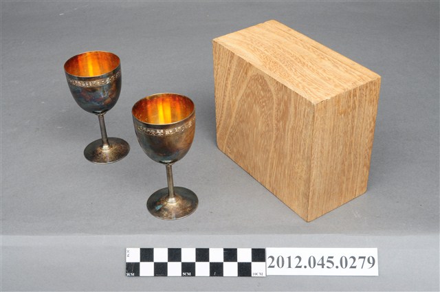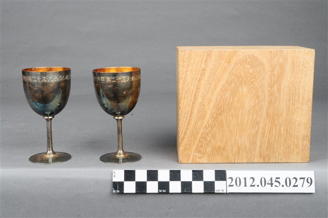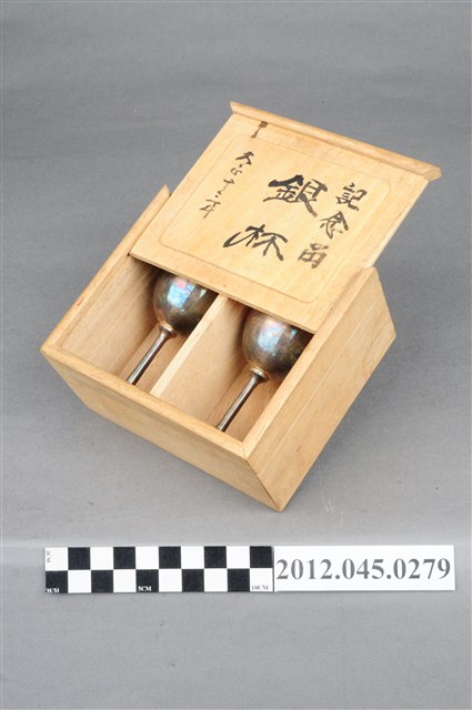 大正12年太子殿下行啟臺北師範學校紀念銀杯組,共1組3件,包括收納木盒與2只銀杯。大正12年(1923年)4月,皇太子裕仁親王(即日後昭和天皇)以攝政的身份搭乘「金剛號」抵臺,開啟在臺灣12天的視察之旅。裕仁皇太子的足跡遍及臺北、新竹、臺中、臺南、高雄、屏東、澎湖與基隆,其所到之處的地方官員無不佈置「奉迎門」、動員大批民眾、學生來「奉迎」,並在皇太子尋訪過後矗立紀念碑或生產紀念物,可謂當時最重要的年度盛事。本銀杯組即是皇太子於4月18日上午抵達臺北師範學校與附屬小學校參觀後,隔年生產的紀念品。臺北師範學校原為「國語學校」師範部,為日治時代培育公學校教師的搖籃,臺北師範學校經多次改制,今為臺北市立大學。