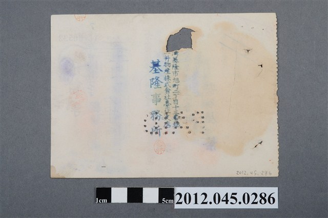 1.本物件為臺灣銀行發出之金額貳百八拾八圓支票,採橫式印刷。支票右側印有「小切手」3字,意即日文支票之意,3字左上方蓋有1個圓形章及1個「增補」二字章,3字左下方印有支配人兩欄,欄內各蓋有1個紅色圓形章;小切手字樣左方留白,留白處上方印刷「金」字,金字下方由上而下以筆書寫「貳百八拾八圓也」字樣。支票中央由上而下、自右而左印有「右金額此小切手引換ニ持參人ヘ御拂渡可被成候也」(意指右方金額可轉讓給支票持有人)、「昭和 拾九年拾月弍拾日」、「振出地臺北州基隆市」等3行,其中,日期行數字是用筆書寫;振出地左方留白,留白處由上而下、自右而左蓋印「東亞海運株式會社」、「基隆出張所長」、「東亞海運株式會社」等3行字,名字下方蓋有篆體社長職位圓形章,留白欄下方打有以圓洞構成的「PAID」字樣;支票左方由上而下、自右而左印有「臺北州基隆市」、「株式會社臺灣銀行」等字,左方邊界處蓋有1個騎縫章;支票右上角印有「YL00592」編號,編號左上方再印有綠色「6」編號。支票背面中央偏右處由上而下、自右而左印有「臺灣基隆市旭町二丁目十三番地」、「三井物產株式會社臺北支店」、「基隆事務所」等3行字。2.本物件為臺灣銀行發出的支票,臺灣銀行成立於1899年6月,是臺灣第一家現代銀行。