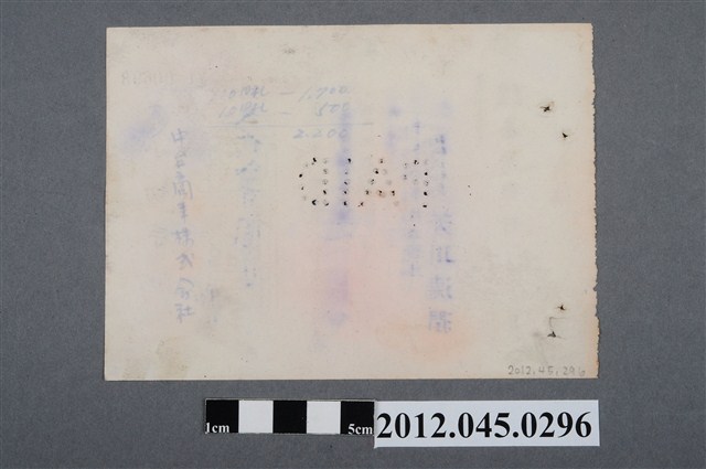 1.本物件為臺灣銀行發出之金額2,200圓支票,採橫式印刷。支票右側印有「小切手」3字,意即日文支票之意,3字上方蓋有1個印有「Aリ預」字樣的圓形章及1個「增補」二字章,3字左下方印有支配人、照印兩欄,欄內各蓋有1個紅色圓形章,欄位下方以筆書寫「¥2,200.00」數字;小切手字樣左方留白,留白處上方印刷「金」字,金字下方由上而下以筆書寫「弍仟弍百圓也」字樣。支票中央由上而下、自右而左印有「右金額此小切手引換ニ持參人ヘ御拂渡可被成候也」(意指右方金額可轉讓給支票持有人)、「昭和十九年 月 日」、「振出地臺北州基隆市」等3行,其中,日期行數字係以筆書寫,但月、日字跡不明;振出地左方留白,留白處由上而下、自右而左蓋印「中臺商事株式會社」、「取締役社長芳 川德潤」,芳川德潤名字右下方蓋有篆體姓名圓形章,支票中央以圓洞構成「PAID」字樣;支票左方由上而下、自右而左印有「臺北州基隆市」、「株式會社臺灣銀行」等字;支票右上角印有「YL00692」編號,編號左上方再印有藍色編號。背面空白。2.本物件為臺灣銀行發出的支票,臺灣銀行成立於1899年6月,是臺灣第一家現代銀行。