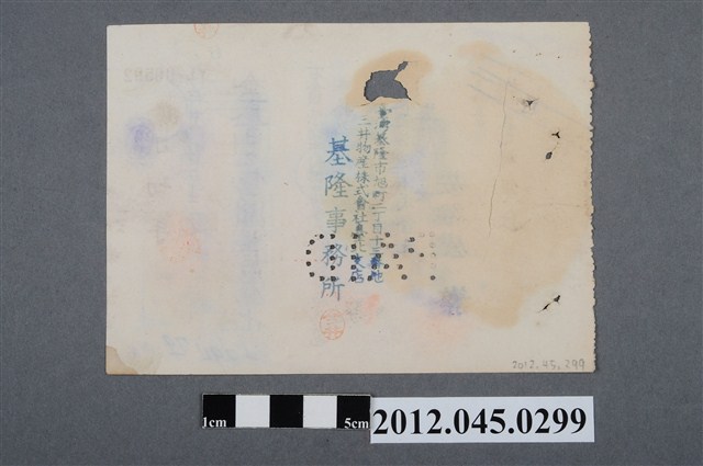 1.本物件為臺灣銀行發出之金額294.79圓支票,採橫式印刷。支票右側印有「小切手」3字,意即日文支票之意,3字上方蓋有1個印有「Aリ預」字樣的圓形章及1個「增補」二字章,3字左下方印有支配人、照印兩欄,欄內各蓋有1個紅色圓形章;小切手字樣左方留白,留白處上方印刷「金」字,金字下方由上而下以筆書寫「貳百九拾四圓七拾九錢也」字樣,字樣下方橫寫「¥294.79」。支票中央由上而下、自右而左印有「右金額此小切手引換ニ持參人ヘ御拂渡可被成候也」(意指右方金額可轉讓給支票持有人)、「昭和拾九年拾月弍拾八日」、「振出地臺北州基隆市」等3行,其中,日期行數字是以筆書寫;振出地左方留白,留白處由上而下、自右而左蓋印「東亞海運株式會社」、「基隆出張所長」、「安古屋繁」,安古屋繁名字下方蓋有篆體姓名圓形章,留白欄中央處以圓洞構成「PAID」字樣;支票左方由上而下、自右而左印有「臺北州基隆市」、「株式會社臺灣銀行」等字,左下角邊界處蓋有1個騎縫章;支票右上角印有「YL00591」編號,編號左上方再印有綠色「5」編號。支票背面中央由上而下、自右而左有「臺灣基隆市旭町二丁目十三番地」、「三井物產株式會社臺北支店」、「基隆事務所」印。2.本物件為臺灣銀行發出的支票,臺灣銀行成立於1899年6月,是臺灣第一家現代銀行。