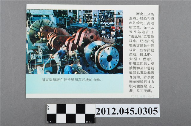 此物件為政治宣傳單,彩色雙面印刷,標題為「上海製造萬噸輪」,簡介中華人民共和國在1960年代上海造船工業。此件為1970年代中華人民共和國針對臺灣所使用之政戰文宣,目的在拉近臺灣民眾對於「祖國大陸」的認同感,並拉攏臺灣人民。 中國共產黨主政的中華人民共和國對外宣傳每個時期都有不同的策略與政策,建國初期,中共對臺灣的政治宣傳以「武力解放臺灣」為主軸,至1954年第一次臺海危機之後,美國與中華民國簽訂「中美共同防禦條約」,中共宣傳政策因而轉以「和平解放臺灣」為主。代表性的做法是使用廣播、心戰傳單、報紙等媒介向臺灣散佈宣傳訊息,更於1958年在福建建立前線電台《海峽之聲》。 到了1970年代,美國與中共關係改善,除持續進行空飄傳單以及廣播外,更將工作目標轉向美國,鼓吹「中國人自己解決臺灣問題」,要求美軍自臺灣撤軍,並且在「釣魚台事件」中,爭取留學生以及華裔學者的認同。在鄧小平時期,中共則將宣傳主軸從「解放臺灣」轉為「和平統一」,並公開發表〈告臺灣同胞書〉以及〈關於停止砲擊大、小金門等島嶼的聲明〉,甚至發表「和平統一,一國兩制」之說,營照兩岸和平的氛圍。