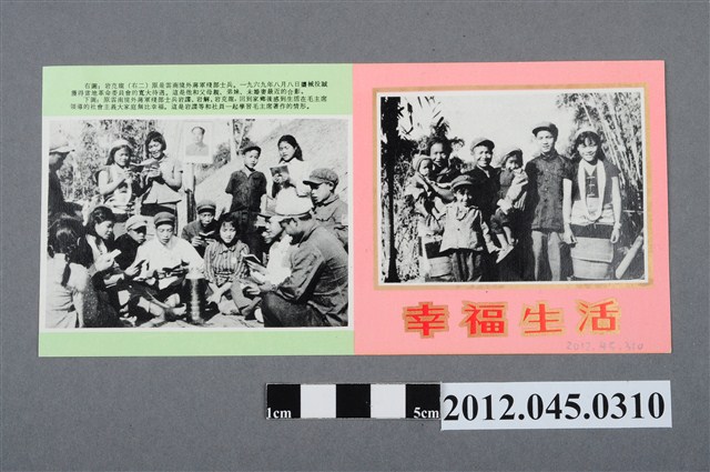 此物件為政治宣傳單,彩色雙面印刷,標題為「投誠回鄉光明幸福」,內容為投誠軍民在中華人民共和國裡安居樂業的生活。正面左側印有「毛主席語錄」欄位,摘錄毛澤東在《中國人民解放軍宣言》裡對於歸順人員不殺不辱,甚至將予以獎勵的承諾。此件為1970年代中華人民共和國針對臺灣所使用之政戰文宣,目的在拉近臺灣民眾對於「祖國大陸」的認同感,並拉攏臺灣人民。 中國共產黨主政的中華人民共和國對外宣傳每個時期都有不同的策略與政策,建國初期,中共對臺灣的政治宣傳以「武力解放臺灣」為主軸,至1954年第一次臺海危機之後,美國與中華民國簽訂「中美共同防禦條約」,中共宣傳政策因而轉以「和平解放臺灣」為主。代表性的做法是使用廣播、心戰傳單、報紙等媒介向臺灣散佈宣傳訊息,更於1958年在福建建立前線電台《海峽之聲》。 到了1970年代,美國與中共關係改善,除持續進行空飄傳單以及廣播外,更將工作目標轉向美國,鼓吹「中國人自己解決臺灣問題」,要求美軍自臺灣撤軍,並且在「釣魚台事件」中,爭取留學生以及華裔學者的認同。在鄧小平時期,中共則將宣傳主軸從「解放臺灣」轉為「和平統一」,並公開發表〈告臺灣同胞書〉以及〈關於停止砲擊大、小金門等島嶼的聲明〉,甚至發表「和平統一,一國兩制」之說,營照兩岸和平的氛圍。