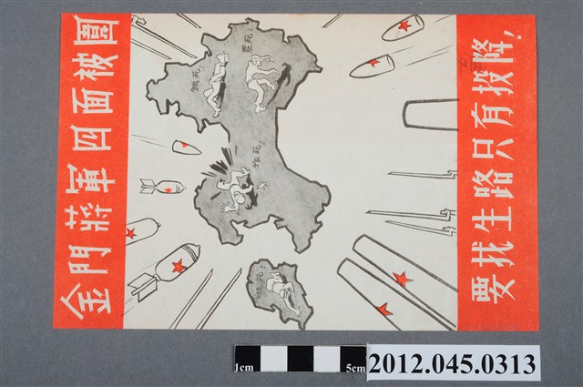 單色雙面繁體中文宣傳單,一面繪製被共軍包圍的金門示意圖,顯然是在1958年金門跑戰時,宣傳鼓勵金門官兵投降。一面刊登被俘軍人郭丁信、一江山戰役投降軍人返鄉團圓照片。