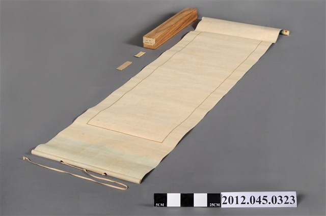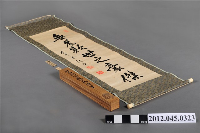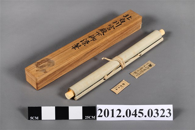 ::: 北白川宮能久親王墨寶《無為欺世之豪傑》卷軸(附收納盒、裝軸記錄紙片、註記木片)