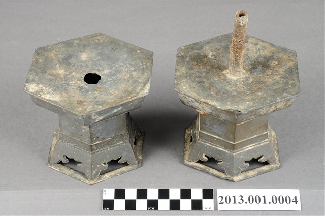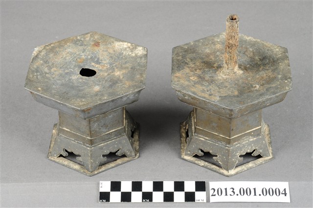 本對燭臺材質為錫造,作六角束腰盆體,尖足、帶拖泥,上部承一柱型燭插。其中一件燭插脫落,高度僅餘8.9公分。物件原置於捐贈者位於台南山上鄉祖厝廳堂作使用。