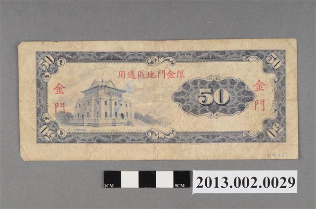 臺灣銀行民國58年發行。正面孫中山像加印紅色字「金門」字樣;背面則為莒光樓圖像加印「金門」及「限金門地區通用」紅色字樣。限金門地區通用的新臺幣伍拾圓紙鈔,紙質顏色呈墨紫色,限馬祖地區通用的新臺幣伍拾圓紙鈔,紙質顏色則為寶藍色。