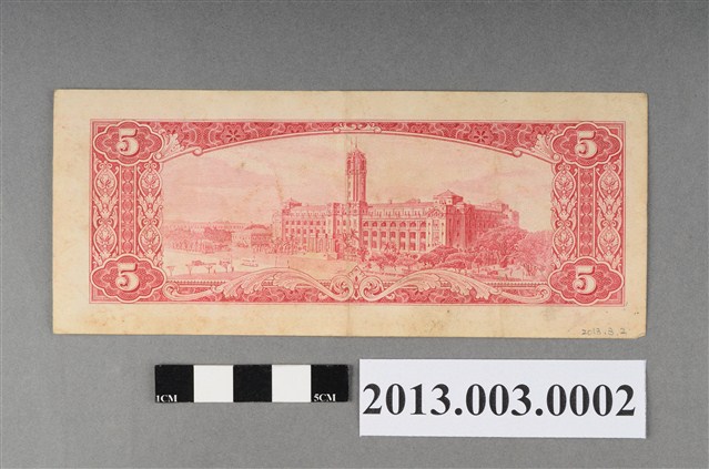 此張為民國50年臺灣銀行所開始印製發行之紅色伍圓紙鈔,正面右邊風景圖是鵝鑾鼻燈塔,背面圖案是總統府。