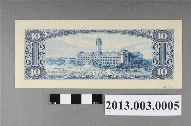 此張為民國49年臺灣銀行所開始印製發行之藍色拾圓紙鈔,正面圖案右側為西螺大橋,背面圖案是總統府。